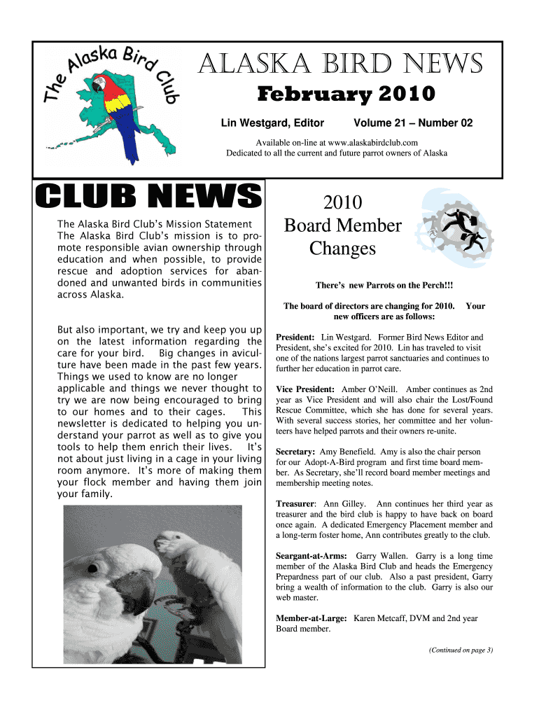 ALASKA BIRD NEWS February 2010 Lin Westward, Editor Volume 21 Number 02 Available online at www.alaskabirdclub.com Dedicated to all the current and future parrot owners of Alaska The Alaska Bird Clubs