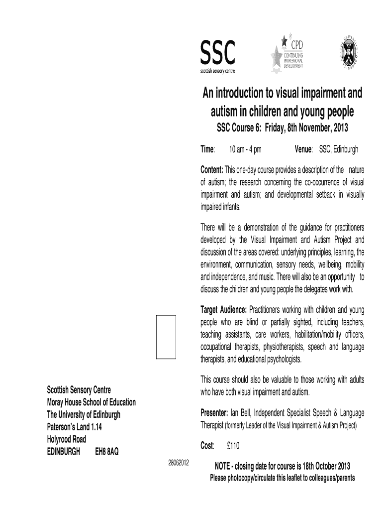 An introduction to visual impairment and autism in children and young people SSC Course 6: Friday, 8th November, 2013 Time: 10 am 4 pm Venue: SSC, Edinburgh Content: This one day course provides a