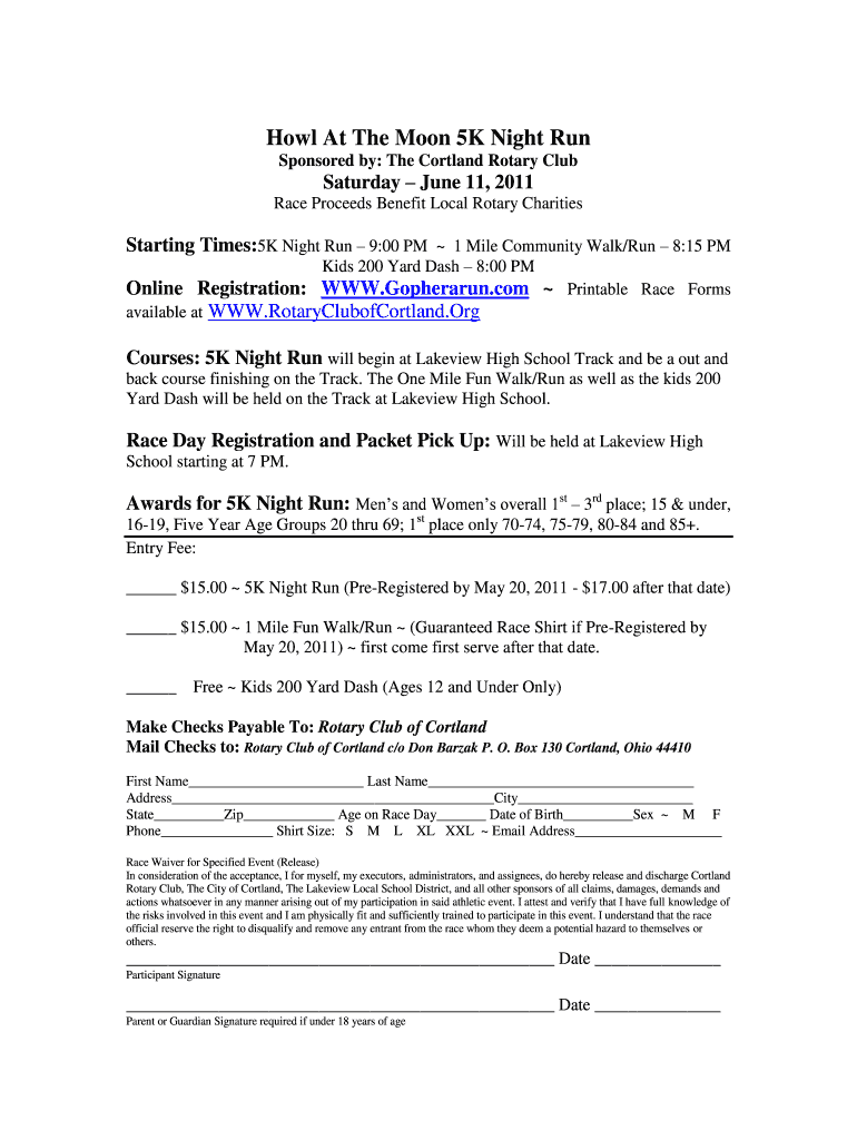 Howl At The Moon 5K Night Run Sponsored by: The Cortland Rotary Club Saturday, June 11, 2011, Race Proceeds Benefit Local Rotary Charities Starting Times:5K Night Run 9:00 PM 1 Mile Community Walk×Run