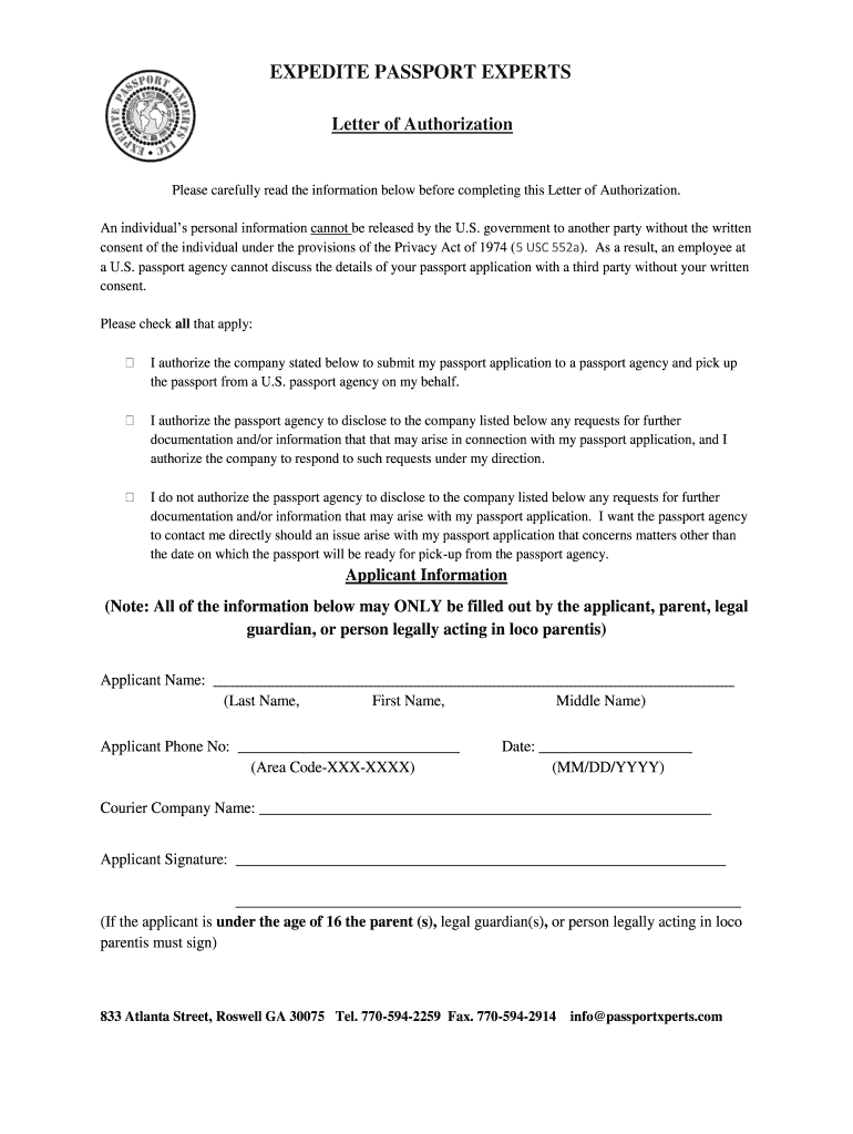 EXPEDITE PASSPORT EXPERTS Letter of Authorization Please carefully read the information below before completing this Letter of Authorization. An individuals personal information cannot be released