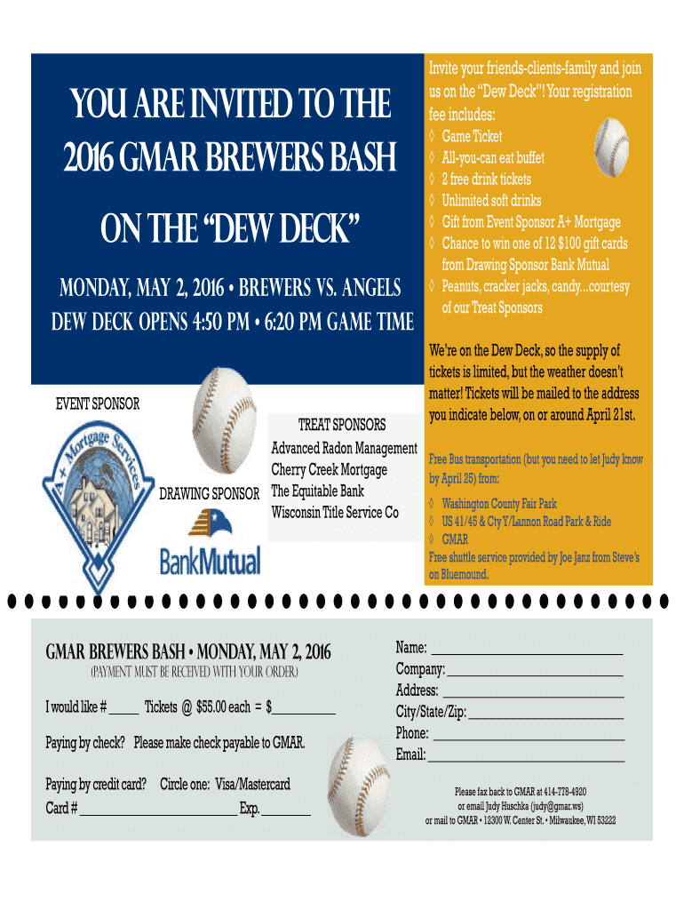 You are invited to the 2016 GEAR Brewers Bash on the Dew Deck Monday, May 2, 2016, Brewers vs. angels Dew Deck opens 4:50 pm 6:20 pm Game time EVENT SPONSOR DRAWING SPONSOR TREAT SPONSORS Advanced