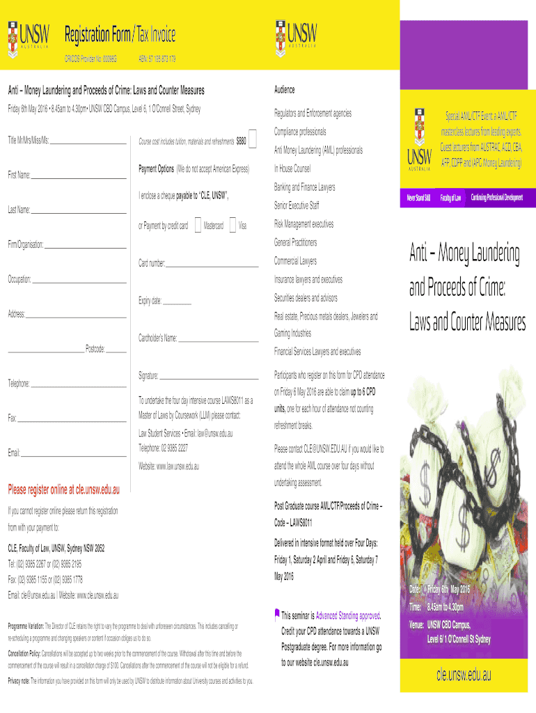 Registration Form /Tax Invoice CRICKS Provider No: 00098G ABN: 57 195 873 179 Anti Money Laundering and Proceeds of Crime: Laws and Counter Measures Audience Friday 6th May 2016 8.45am to 4.30pm UNSW