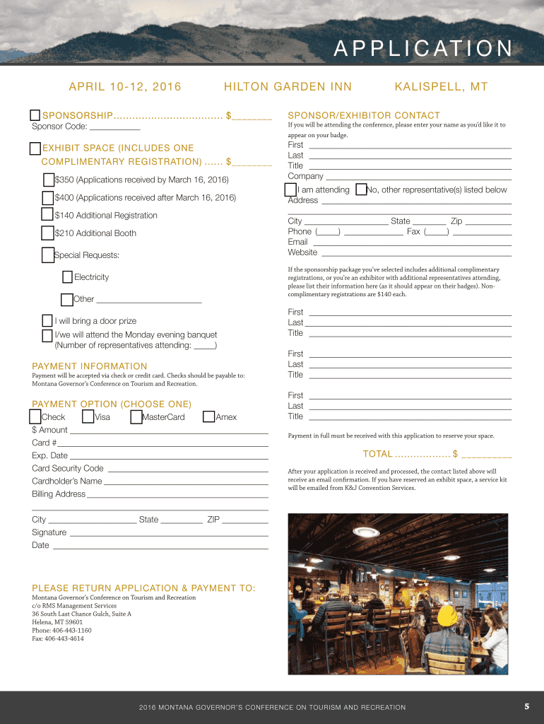 A P P L I C AT I O N APRIL 1012, 2016 HILTON GARDEN INN SPONSORSHIP ................................... $ Sponsor Code: KALISPELL, MT SPONSOR×EXHIBITOR CONTACT If you will be attending the conference,