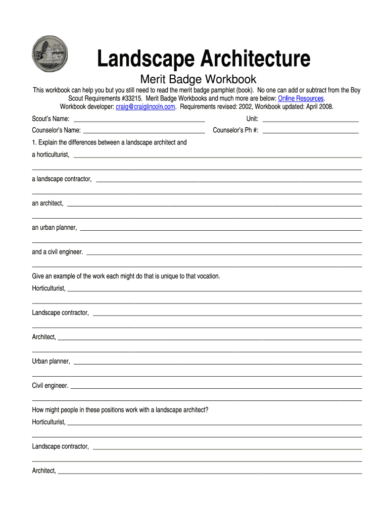 Landscape Architecture Merit Badge Workbook This workbook can help you, but you still need to read the merit badge pamphlet (book×. No one can add or subtract from the Boy Scout Requirements #33215.