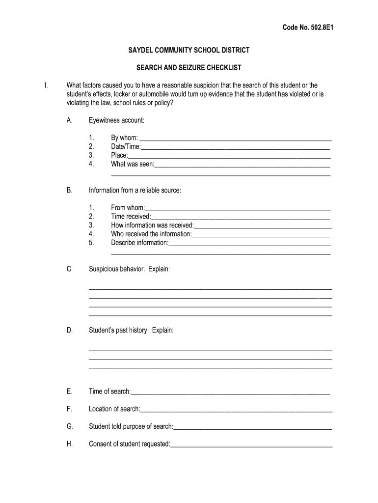 Code No. 502.8E1 SAY DEL COMMUNITY SCHOOL DISTRICT SEARCH AND SEIZURE CHECKLIST I. What factors caused you to have a reasonable suspicion that the search of this student or the students effects, locker