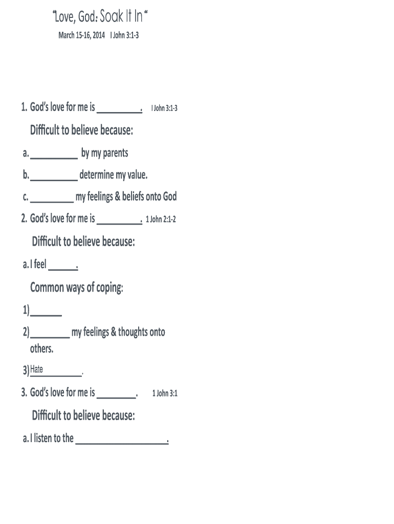 Love, God:: Soak It In Love, God:: Soak It In March 15-16, 2014 I John 3:1-3 March 15-16, 2014 I John 3:1-3 1. God s love for me is. I John 3:1-3 Difficult to believe because: 1. God s love for me