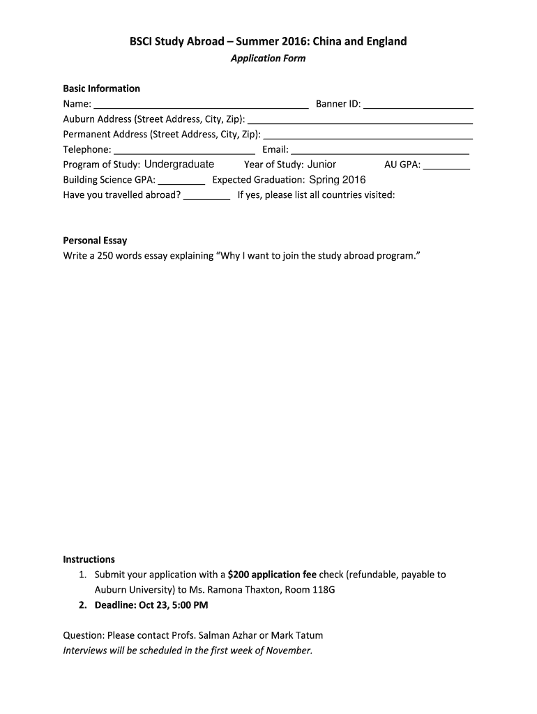 SCI Study Abroad Summer 2016: China and England Application Form Basic Information Name: Banner ID: Auburn Address (Street Address, City, Zip): Permanent Address (Street Address, City, Zip): Telephone: