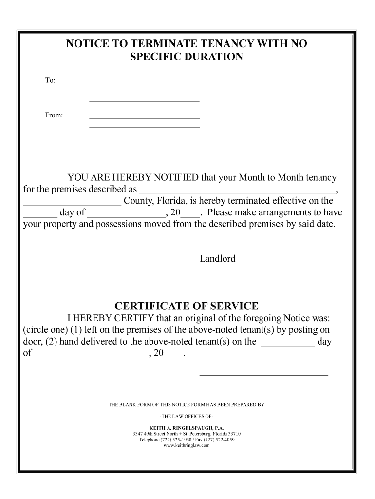 NOTICE TO TERMINATE TENANCY WITH NO SPECIFIC DURATION To: From: YOU ARE HEREBY NOTIFIED that your Month-to-Month tenancy for the premises described as, County, Florida, is hereby terminated effective
