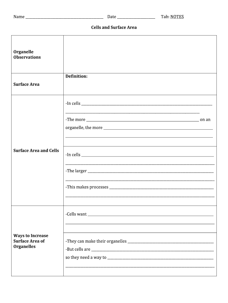 Name Date Tab: NOTES Cells and Surface Area Organelle Observations Surface Area Definition: In cells The more on an organelle, the more Surface Area and Cells In cells The