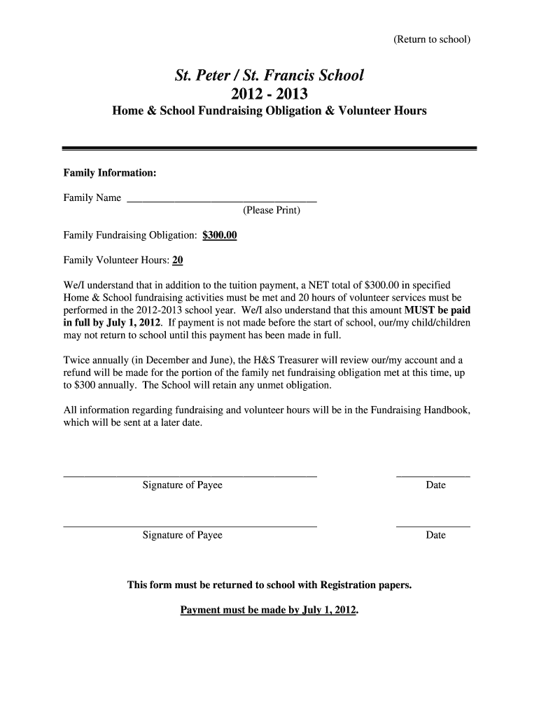 (Return to school) St. Peter / St. Francis School 2012 2013 Home & School Fundraising Obligation & Volunteer Hours Family Information: Family Name (Please Print) Family Fundraising Obligation: $300.00