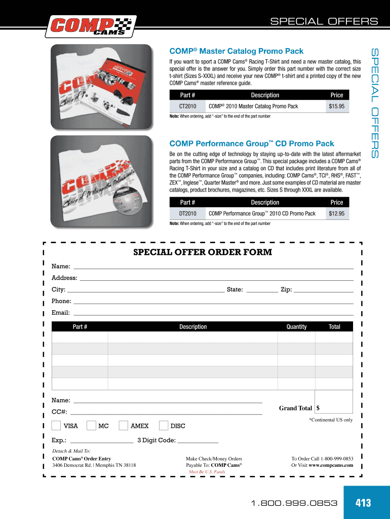 The COMP Cams Special Offer Order Form is a business form used by customers to place orders for special offers from COMP Cams, including merchandise like t-shirts and catalogs.