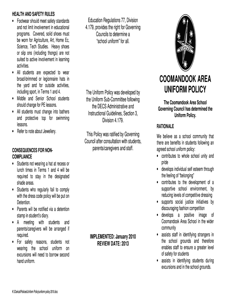 K: Clerical Policies Uniform Policy 2010.doc. HEALTH AND SAFETY RULES. Footwear should meet safety standards and not limit involvement ...
