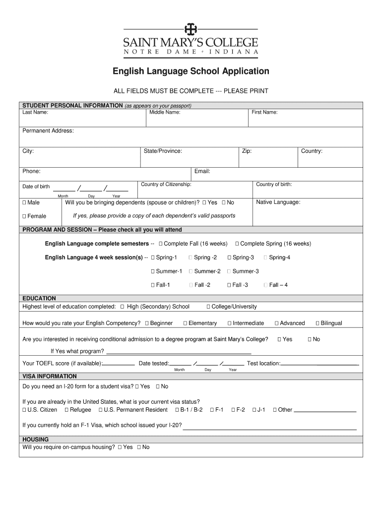 Get the free English Language School Application - Saint Marys College - cwil saintmarys