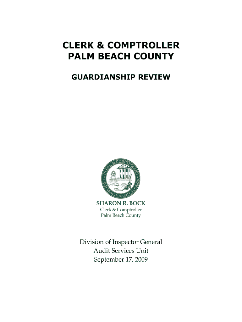 This document provides a review of the guardianship auditing function, highlighting areas for improvement and recommendations for enhancing the processes related to guardianship audits in Palm Beach