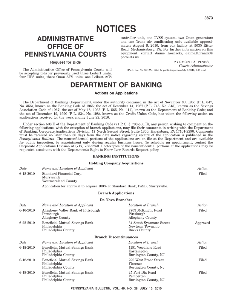 3873 NOTICES ADMINISTRATIVE OFFICE OF PENNSYLVANIA COURTS Request for Bids The Administrative Office of Pennsylvania Courts will be accepting bids for previously used three Lambert units, four UPS