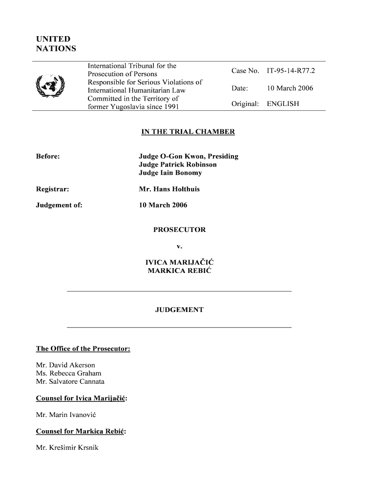UNITED NATIONS International Tribunal for the Prosecution of Persons Responsible for Serious Violations of International Humanitarian Law Committed in the Territory of former Yugoslavia since 1991