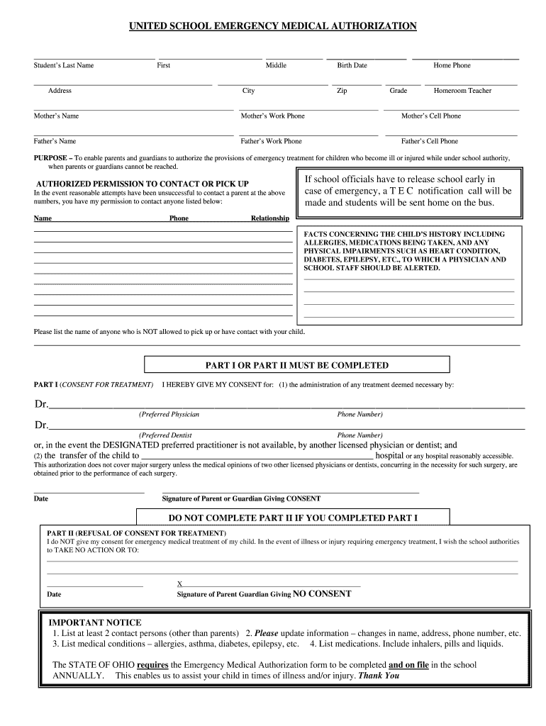UNITED SCHOOL EMERGENCY MEDICAL AUTHORIZATION Students Last Name First Middle Birth Date Home Phone Address City Zip Grade Homeroom Teacher Mothers Name Mothers Work Phone Mothers Cell Phone Fathers