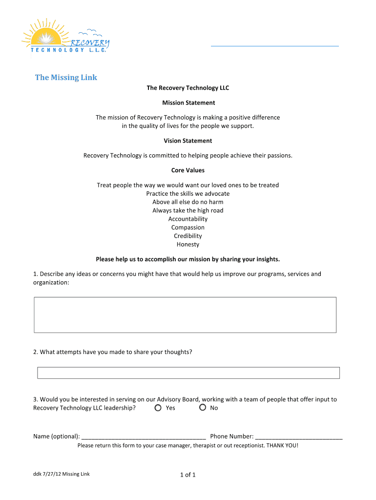 Get the free Missing Link Form - Recovery Technology LLC - recoverytechnology