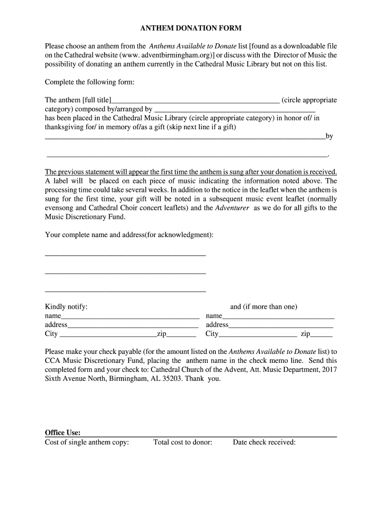 Get the free ANTHEM DONATION FORM - Cathedral Church of the Advent - adventbirmingham