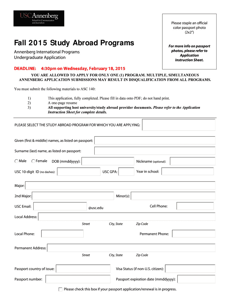 Please staple an official color passport photo (2×2 “) Fall 2015 Study Abroad Programs For more info on passport photos, please refer to Application Instruction Sheet. Vandenberg International