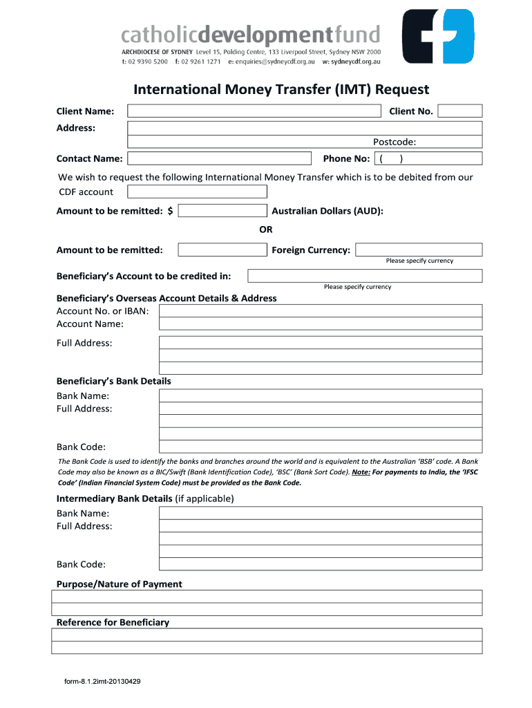 Get the free International Money Transfer IMT Request - Sydney CDF - sydneycdf org