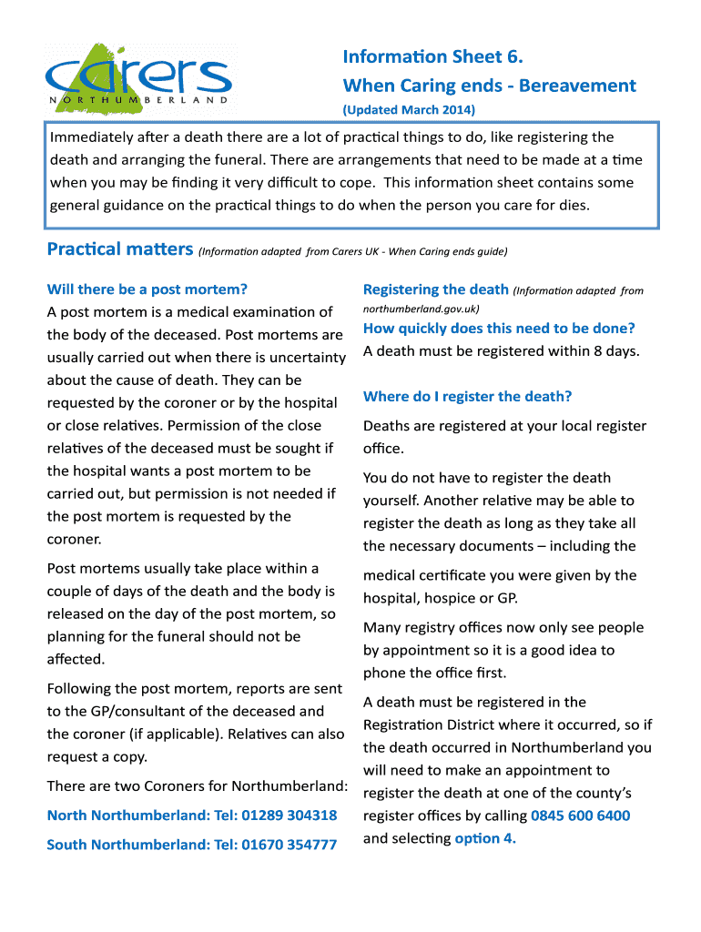 Information Sheet 6. When Caring ends Bereavement (Updated March 2014×Immediately after a death there are a lot of practical things to do, like registering the death and arranging the funeral. There