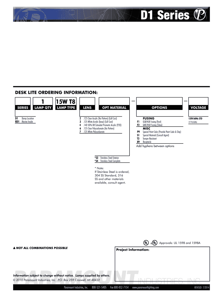 D1 Series FLUORESCENT SURFACE 45.0 DESK LITE 45.0 APPLICATIONS: L×CUL Listed U Damp Location Industrial & Commercial L Listed Marine U (Inside) BENEFITS: Luminaires adaptable to your specific needs