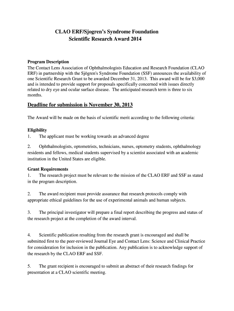 CLAN ERF×Progress Syndrome Foundation Scientific Research Award 2014 Program Description The Contact Lens Association of Ophthalmologists Education and Research Foundation (CLAN ERF) in partnership