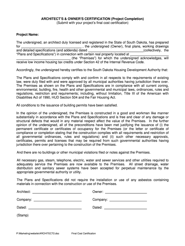 Architects amp owners certification is a document attesting that the construction or renovation project has been designed and executed according to the building codes and regulations.
