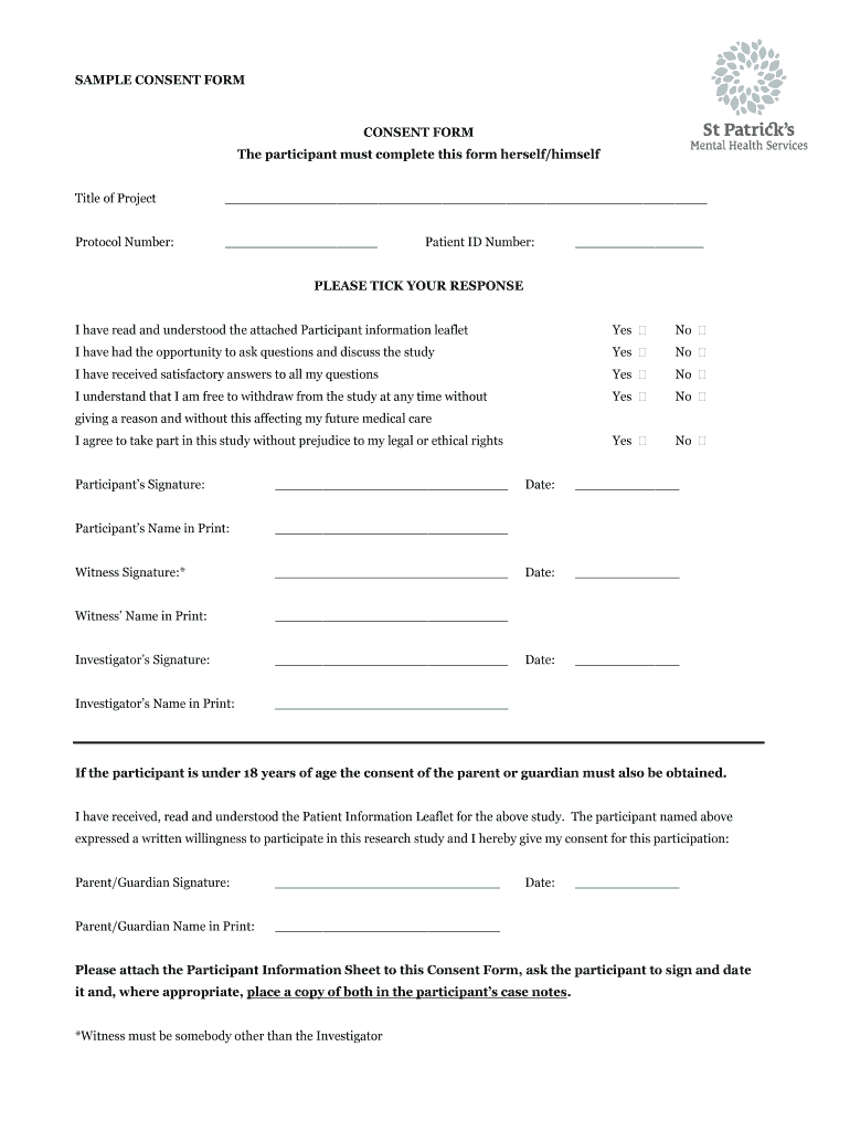 Get the free SAMPLE CONSENT FORM CONSENT FORM The participant must - stpatricks