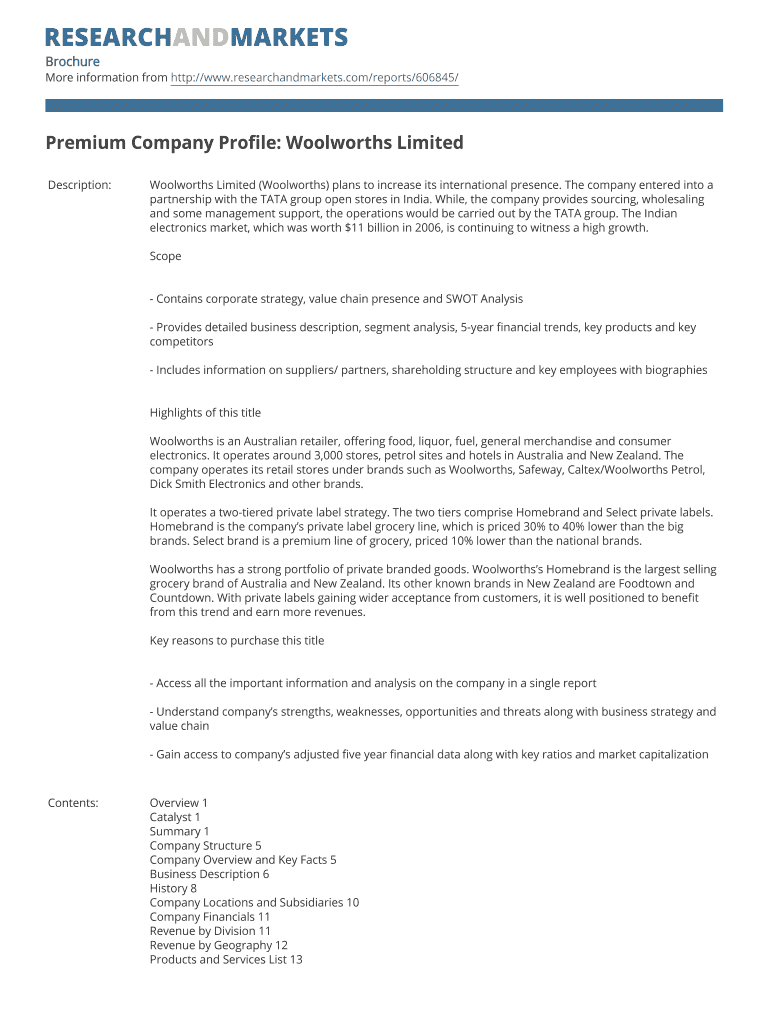 This document provides a comprehensive profile of Woolworths Limited, detailing its corporate strategy, market presence, financial trends, and SWOT analysis. It also includes information on the company's