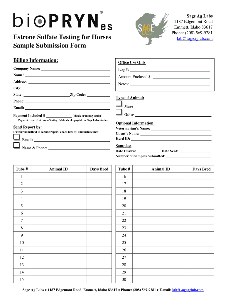 Sage Ag Labs 1187 Element Road Emmett, Idaho 83617 Phone: (208× 5699281 lab sageaglab.com Strong Sulfate Testing for Horses Sample Submission Form Billing Information: Office Use Only Company Name: