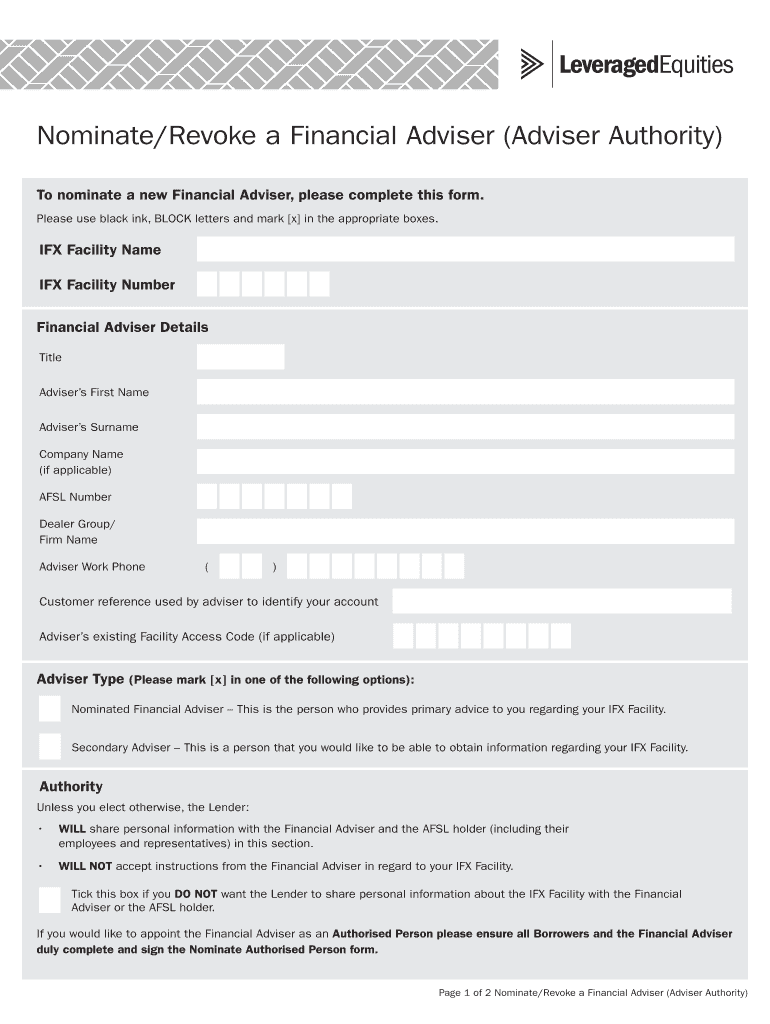 Nominate×Revoke a Financial Adviser (Adviser Authority) To nominate a new Financial Adviser, please complete this form. Please use black ink, BLOCK letters and mark x in the appropriate boxes. IF