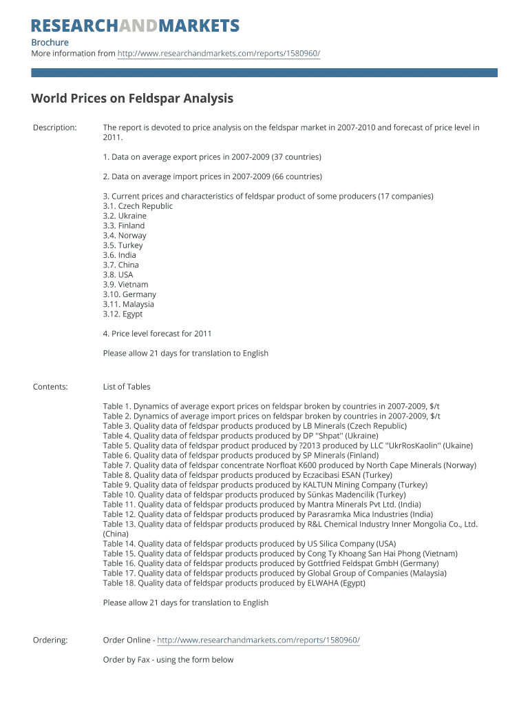 The report provides a comprehensive analysis of the feldspar market prices from 2007 to 2010, including data on import and export prices from various countries and a forecast for 2011.