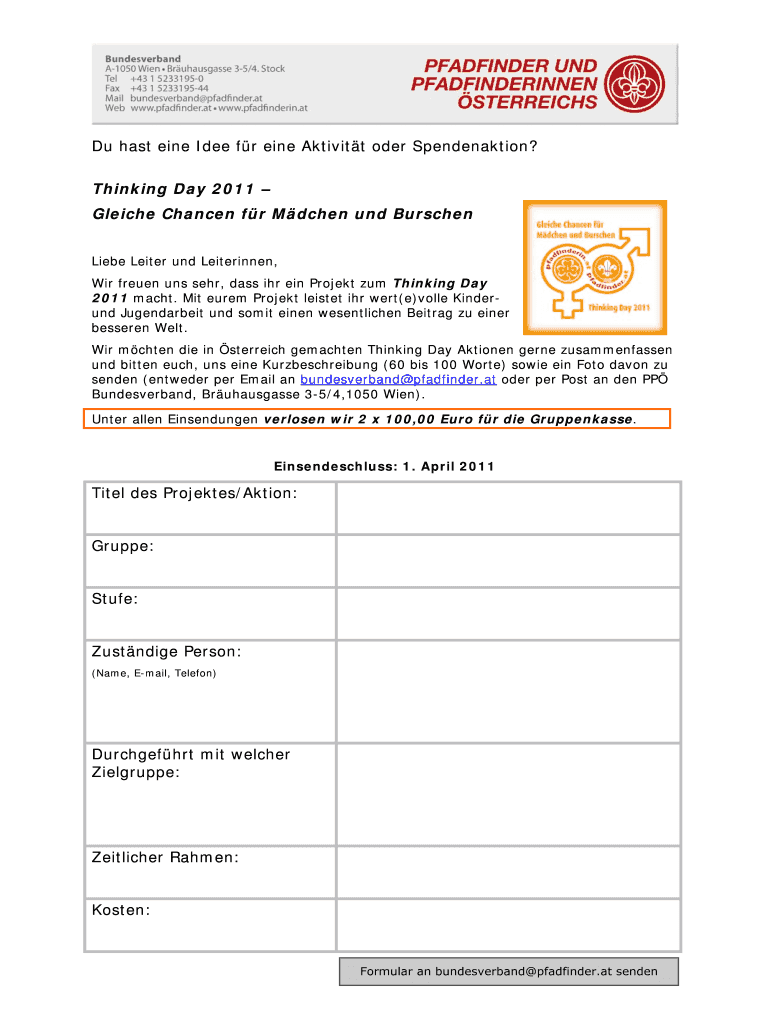 Pathfinder UND Pfadfinderinnen Sierras Bruhausgasse 35×4, 1050 Wain, stretch Eight a Gruppenpostempfnger Landesverbandssekretariate Bundesverbandssekretariat 30. November 2010 Bereft: World Thinking