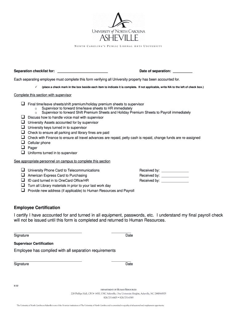 NORTH CAROLINA PUBLIC LIBERAL ARTS UNIVERSITY Separation checklist for: Date of separation: Each separating employee must complete this form verifying all University property has been accounted for.