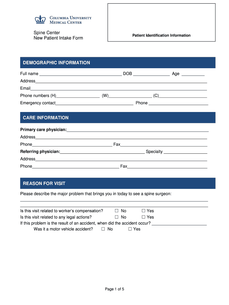 Spine Center New Patient Intake Form Patient Identification Information DEMOGRAPHIC INFORMATION Full name DOB Age Address Email Phone numbers (H) (W) © Emergency contact Phone CARE INFORMATION Primary