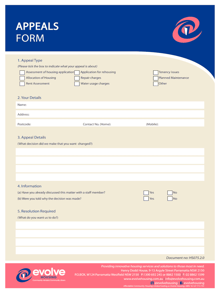 Get the free AppeAls form - Evolve Housing