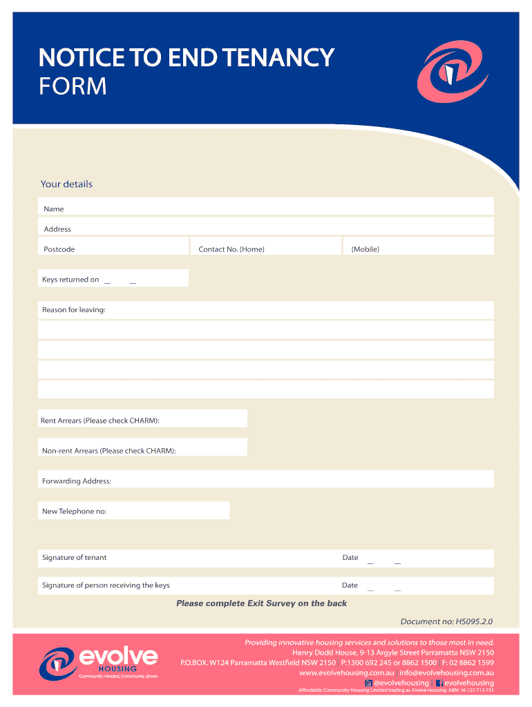 Notice to end tenancy form Your details Name Address Postcode Contact No. (Home) Keys returned on (Mobile) Reason for leaving: Rent Arrears (Please check CHARM): Nonrent Arrears (Please check CHARM):