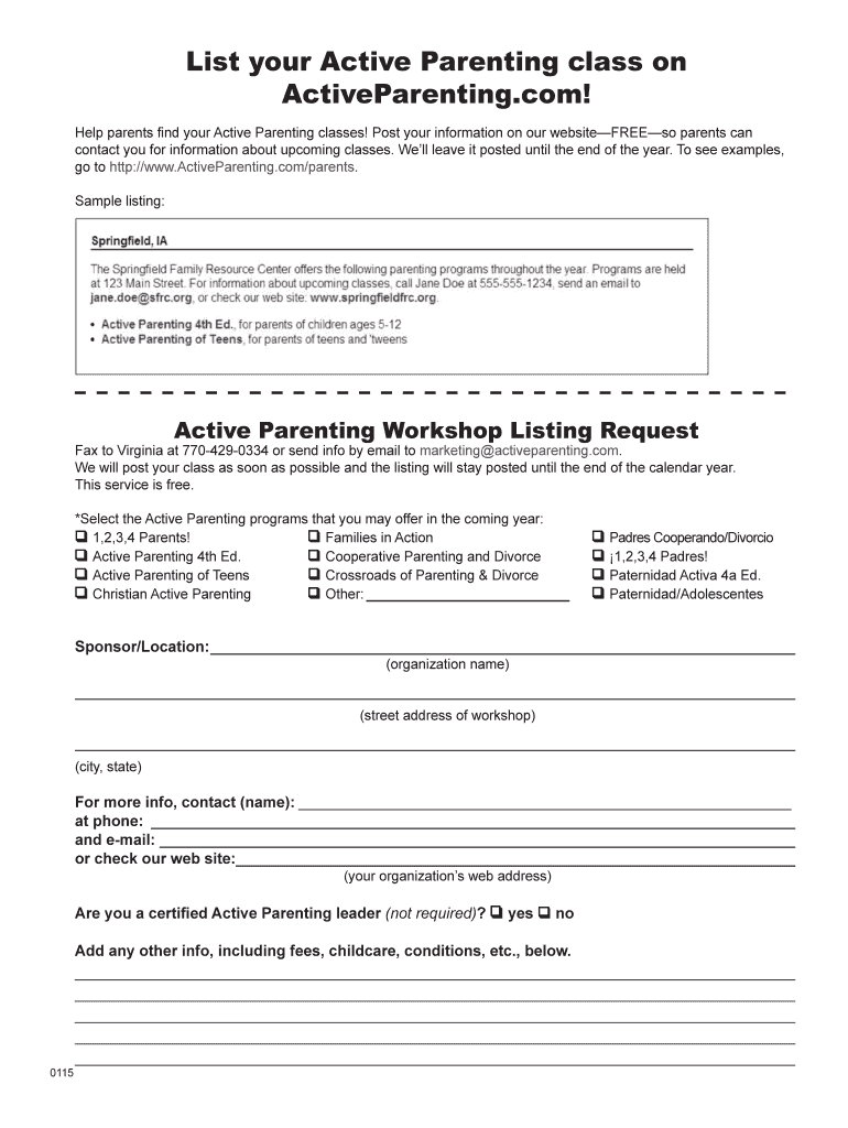 List your Active Parenting class on ActiveParenting.com! Help parents find your Active Parenting classes! Post your information on our websiteFREEso parents can contact you for information about upcoming