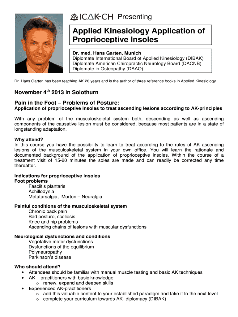 Presenting Applied Kinesiology Application of Proprioceptive Insoles Dr. med. Hans Garden, Munich Diplomat International Board of Applied Kinesiology (DISK) Diplomat American Chiropractic Neurology