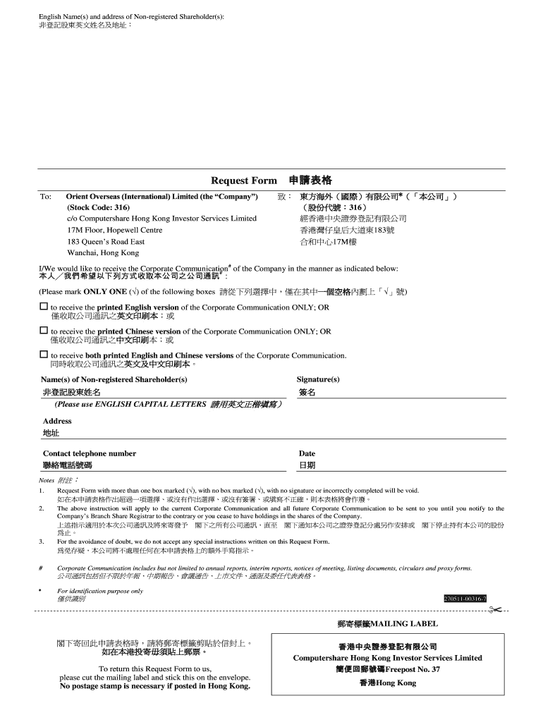 English Name’s) and address of Nonregistered Shareholder’s): Request Form Orient Overseas (International) Limited (the Company) (Stock Code: 316× c×o Computer share Hong Kong Investor Services