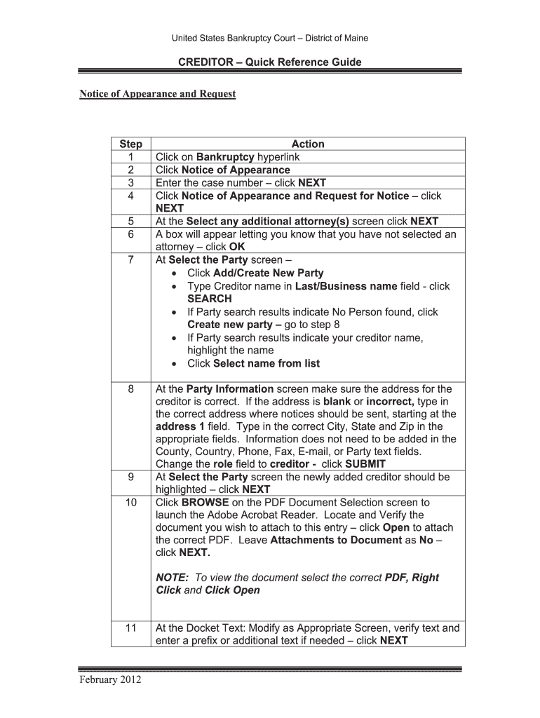 United States Bankruptcy Court District of Maine CREDITOR Quick Reference Guide Notice of Appearance and Request Step 1 2 3 4 5 6 7 8 9 10 Action Click on Bankruptcy hyperlink Click Notice of Appearance