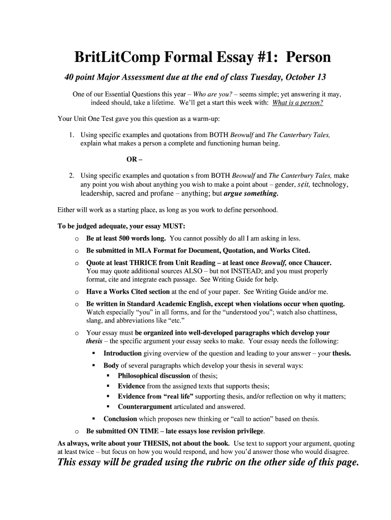 BritLitComp Formal Essay #1: Person 40 point Major Assessment due at the end of class Tuesday, October 13 One of our Essential Questions this year Who are you? Seems simple; yet answering it may,