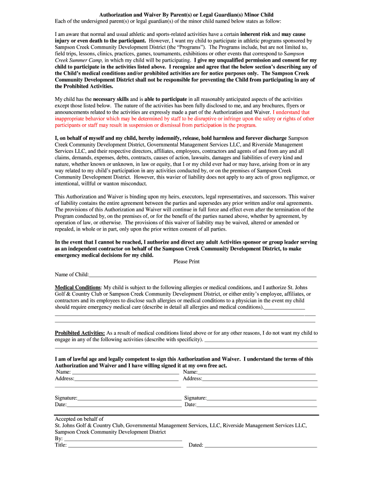Get the free Authorization and Waiver By Parents or Legal Guardians Minor Child