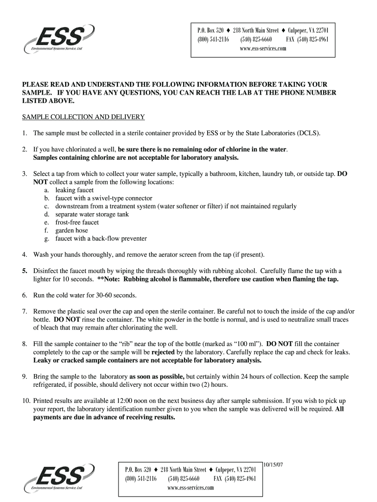 This document contains instructions for collecting and delivering water samples to the Environmental Systems Service, Ltd. (ESS) laboratory, as well as an authenticity release form for the sample