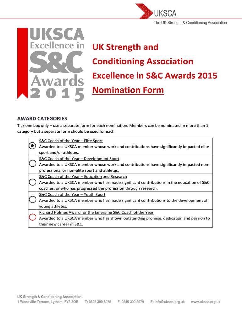 UK Strength and Conditioning Association Excellence in S&C Awards 2015 Nomination Form AWARD CATEGORIES Tick one box only use a separate form for each nomination. Members can be nominated in more