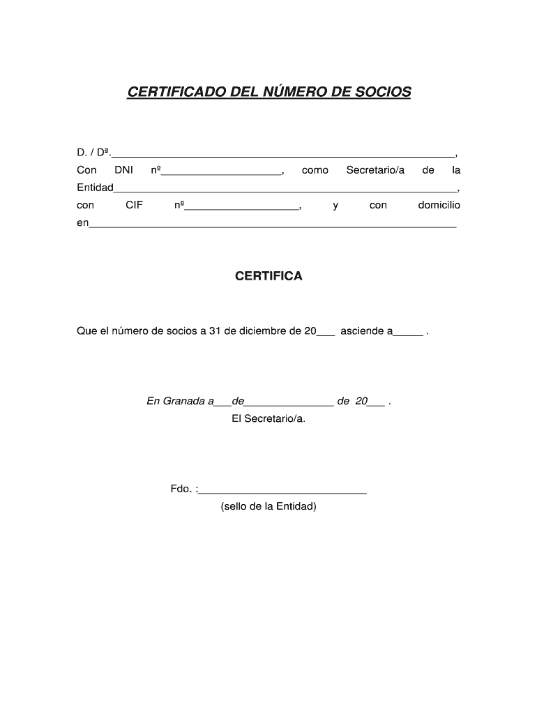 CERTIFICATE DEL NERO DE SOC IOS D. × D., Con DNI n, Como Secretary×a DE la Enticed, con CIF n, y con domicile en CERTIFIED Que el Nero de social a 31 de December de 20 science a . En Granada a DE