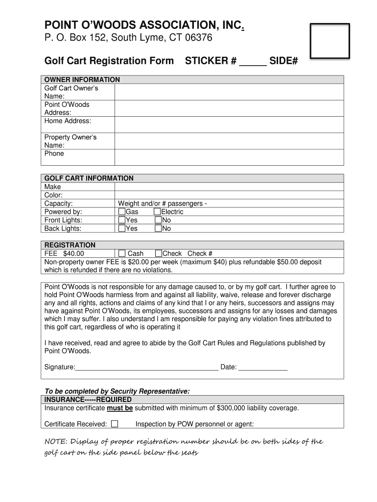 POINT WOODS ASSOCIATION, INC. P. O. Box 152, South Lyme, CT 06376 Golf Cart Registration Form STICKER # SIDE# OWNER INFORMATION Golf Cart Owners Name: Point O 'Woods Address: Home Address: Property