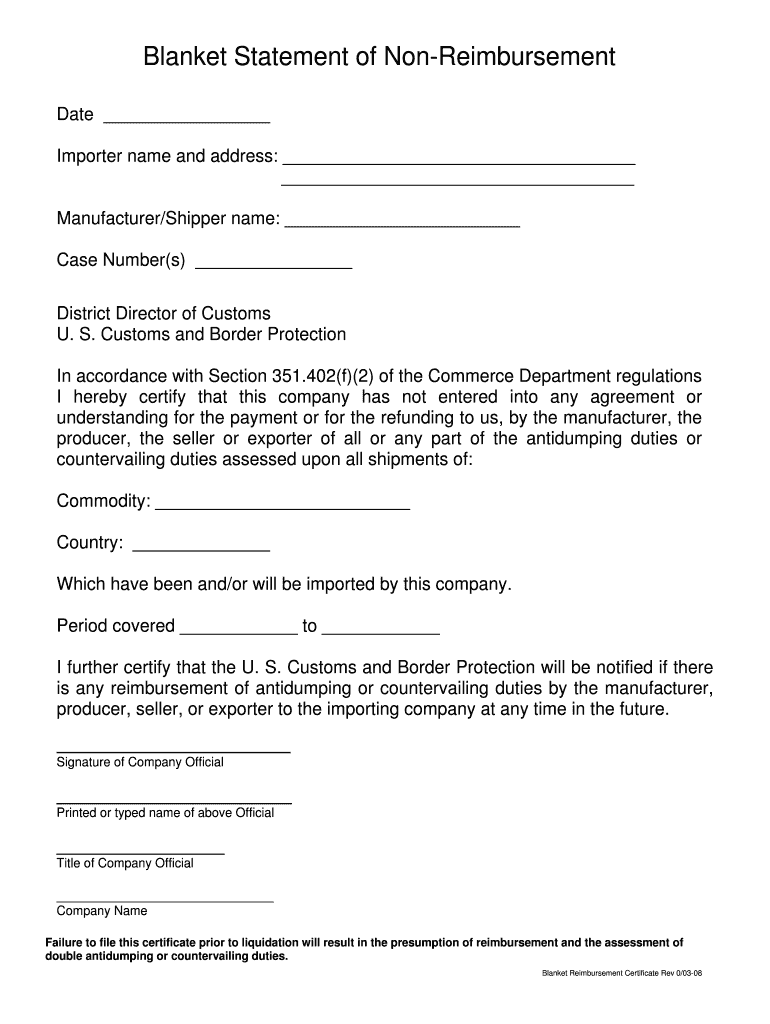 Importers Blanket Statement of Non-Reimbursement. This is a statement advising CBP whether the importer has been reimbursed, or has entered into any agreement or understanding to be reimbursed, for Anti-Dumping Duty (ADD).